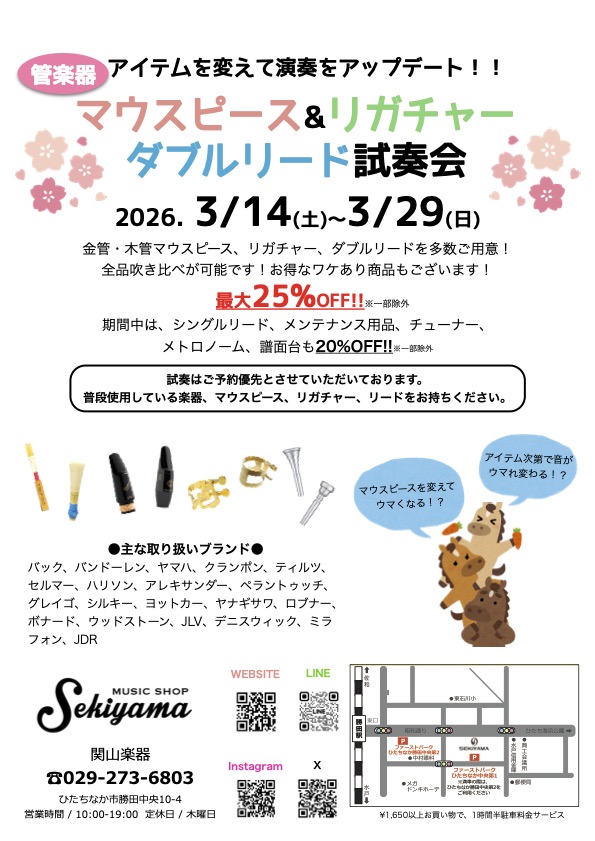 2026.3/14(土)〜3/29(日)の期間、関山楽器にて管楽器マウスピース&リガチャー&ダブルリード試奏会を開催いたします。